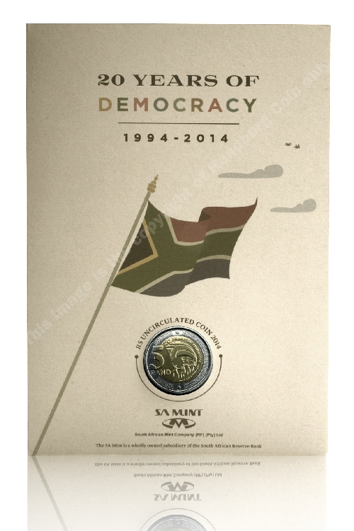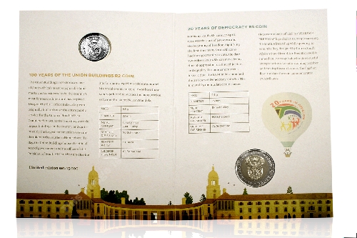20 Years of Democracy R5 Bi-metal coin with R2 100 Yr Anniversary of the Union Buildings coin