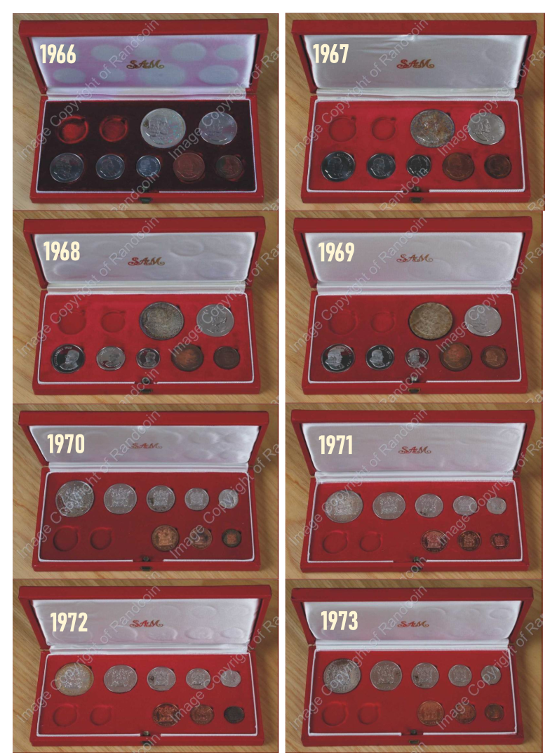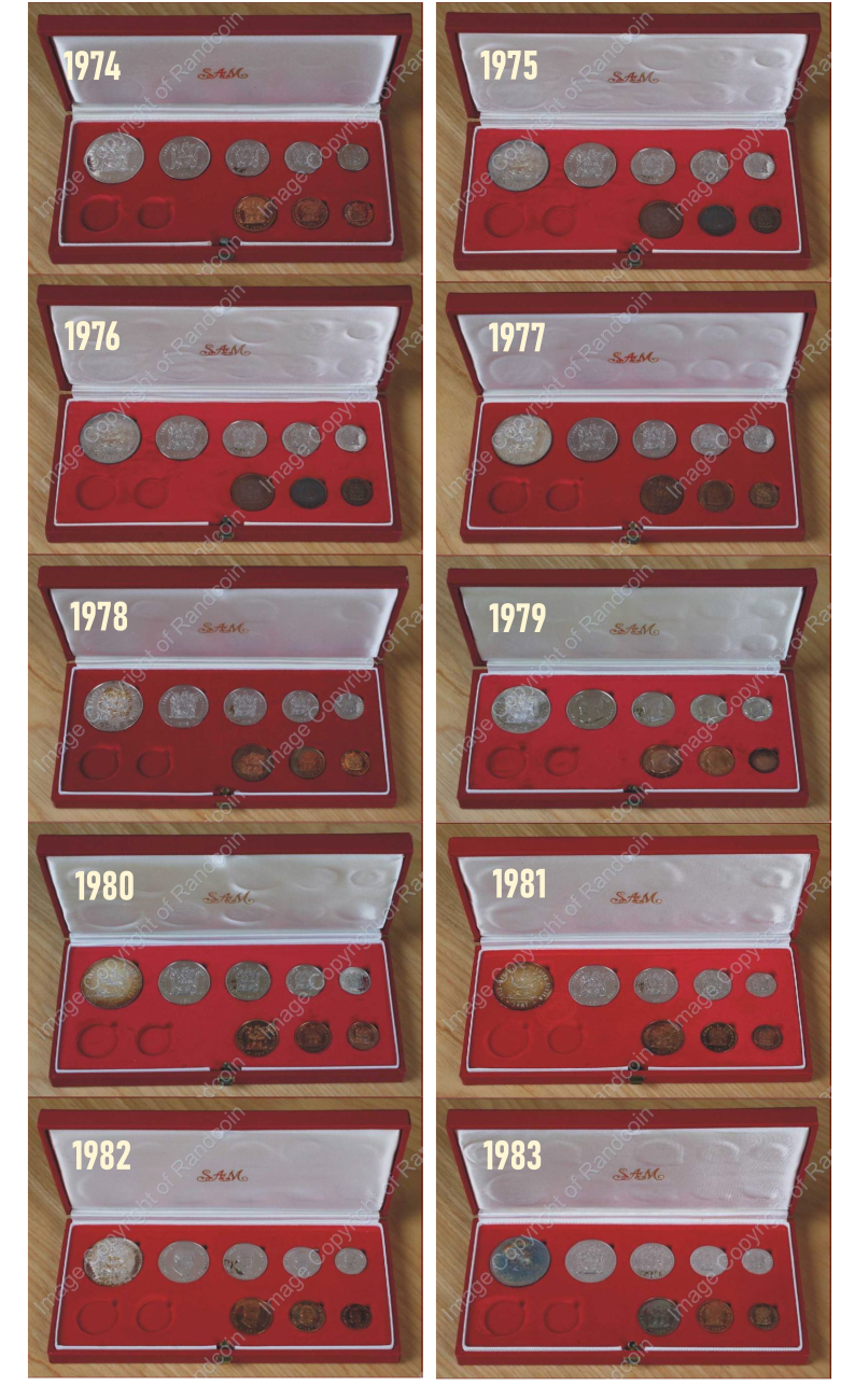 In 1965 , the Mint continued the tradition of offering the so-called "long" proof sets for sale. These sets were similar to the normal short proof sets, but also contained the R1 and R2 gold coins and were housed in very distinct red leatherette cases. Many catalogue writers warn that huge numbers of the gold coins were stripped over the years and complete sets in their original red cases are now becoming scarce. It will in fact be quite difficult for prospective buyers to source the full series of 19 sets from 1965 to 1983.