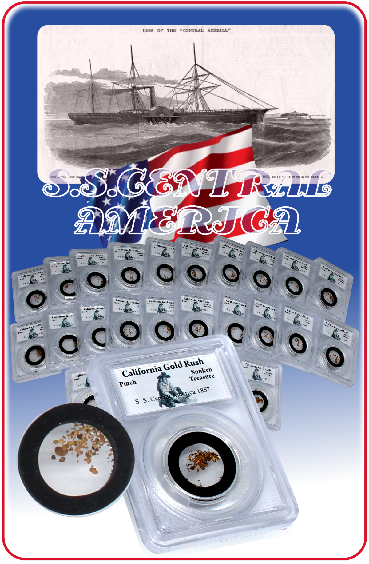 The S.S. Central America, often referred to as the "Ship of Gold," was a 278-foot sidewheel steamer that sank in a hurricane off the coast of South Carolina on September 12, 1857, carrying a massive cargo of California Gold Rush treasure. The ship was travelling from Panama to New York with over 500 passengers and crew, along with approximately 30,000 pounds (over 13,000 kg) of gold in total that had been shipped from San Francisco.